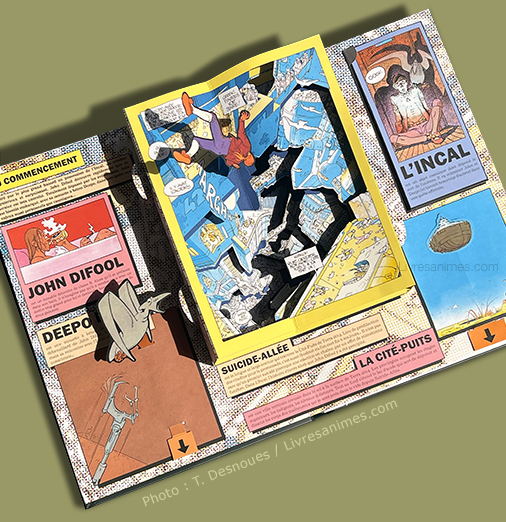 Cette saga réputée irrésumable est pourtant fort bien condensée dans ce pop-up réalisé par Thomas Mathieu sur la base d’un hors-série du magazine Les Humanoïdes Associés paru en 2016. Six doubles-pages d’animations passent en revue les aventures de John Difool en six étapes : le commencement, les alliés, les antagonistes, le voyage cosmique, la bataille finale et le voyage spirituel. |