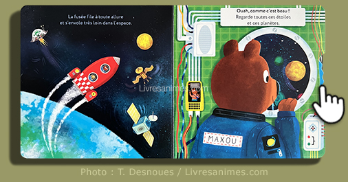 Les animations (roues et tirettes à faire glisser), solides et parfaitement adaptées aux petites mains, accompagnent le jeune lecteur dans le décollage, l’observation des planètes et la découverte de l’apesanteur, tout en réservant quelques surprises grâce aux découpes.