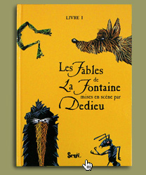 > Plutôt que les fables, ce sont les illustrations de Dedieu qui sont ici mises en scène. À chaque double page, le texte des fables est reproduit de chaque côté d'une fenêtre qui s'ouvre sur des tableaux découpés et mis en perspective grâce à différents plans. La technique, bien connue, trouve ici une expression très aboutie grâce à la finesse des découpes autorisée par le laser et le choix d'un papier noir strié de traits de couleurs (la trace de la découpe est invisible sur l'épaisseur du papier). Dessins et découpes coïncident et se détachent sur un fond de couleur uni. On visualise ainsi une scène de théâtre où se dessinent les silhouettes des personnages.