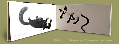 Les éditions Mango ont eu un coup de cœur pour En tension. Il s’agissait alors d’adapter le concept d’animation pour le rendre plus accessible aux enfants tout en conservant ses thèmes comme la rencontre, la différence, l’amitié, la distance et aussi sa palette noir et blanc. Avec l’auteure, ils ont décidé de l’adapter en mettant en scène la rencontre entre deux chats. Ils ont alors proposé à Amandine Delaunay, dont l’univers de prédilection est le noir et blanc, de réaliser les illustrations sur la base d’un story-board de Claire Zuchelli-Romer.