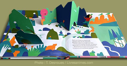 D’autres animations (tirettes dans le premier décor, soufflet et tirette à révolution) viennent varier les plaisirs de l’exploration. Matthew Reinhart, célèbre artiste américain reconnu pour ses livres pop-up (ex.Transformers) signe l’ingénierie papier et les illustrations constituées de collages numériques.