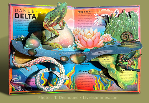 L’ingénierie papier semblera familière aux adeptes de la très belle série animée de la National Geographic Society ou aux amateurs des grandes gueules voraces et dangereuses qui s’ouvrent devant eux dans d’autres recueils identiques. Ils ne devraient pas bouder ici leur plaisir ! On trouve des volets cachant une grande variété d’habitants de la forêt profonde, ou encore ce quadruple rabat révélant en extension une procession de fourmis.