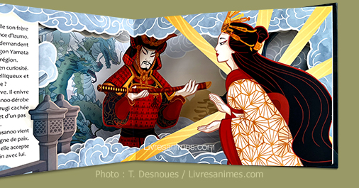 Les graphistes pourront le trouver perfectible sur la gestion des textes mais cela ne gênera pas les amateurs d’illustrations élégantes et soignées : de la naissance de la déesse aux cheveux de jais issue de l’œil gauche du dieu Izanagi, de sa confrontation avec son frère Susanoo le dieu des Tempêtes, insupportable et brutal… jusqu’à leur réconciliation.