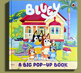 Dans ce premier pop-up de la licence, les enfants et leurs parents retrouveront Bluey avec sa famille de bouviers australiens : sa sœur, sa maman, son papa, les grand-mères et des amis, dans une suite de cinq scènes variées (devant la maison, dans le pré, au bord du ruisseau, dans la piscine, devant un restaurant) indépendantes les unes des autres et probablement extraites d’épisodes. Elles réveilleront certainement les souvenirs des aficionados car, ici, aucune histoire n’est contée, la plupart des personnages ne sont pas nommés et les textes, très succincts, semblent correspondre à un court fragment de dialogue. |