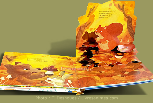 > Ce Conte d’hiver est signé par Ekaterina Kazeykina*, une talentueuse designer papier, seule à être créditée sur la première de couverture ! Assurant la direction artistique du projet et la conception des pop-ups, elle a imaginé avec l’illustratrice Eya Mordyakova l’histoire d’un petit lapin qui, à la sortie de l’hiver, part chercher son copain l’ourson pour une promenade en forêt. Ensemble, ils vont traverser les saisons (indiquées en gras dans le texte) et rencontrer divers animaux.