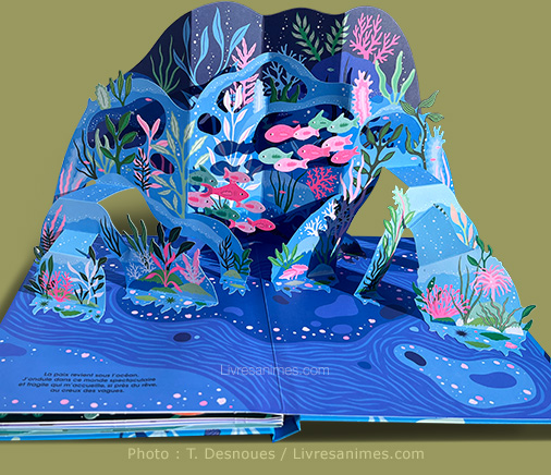 > Océan est le septième livre pop-up d’Elena Selena paru aux éditions Gallimard Jeunesse (après Jardin bleu en 2018, Jungle, Neige, Voyage, Matin rose et plus récemment Loups en 2024)*. Née en 1993, la talentueuse lituanienne formée à l’Académie des Beaux-Arts de Vilnius puis à l’École Estienne (Paris) continue à creuser son sillon d’artiste du papier « complète », concevant à la fois l’ingénierie papier et les illustrations de ses ouvrages. N’hésitez pas à lire sa passionnante interview** publiée sur le site !