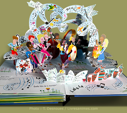 > À l’époque où les éditeurs de livres animés sont contraints de réduire le format, le nombre de pages et les animations de leurs nouveaux titres à cause de l’augmentation du prix du papier et de la fabrication, les Grandes Personnes nous propose un ouvrage important par ses dimensions et ses qualités techniques (dos toilé, revers des pop-ups en couleurs). Son auteur, le talentueux (et prolifique) Philippe UG*, nous offre un feu d’artifice d’illustrations chamarrées et pétillantes sur le thème de la musique.