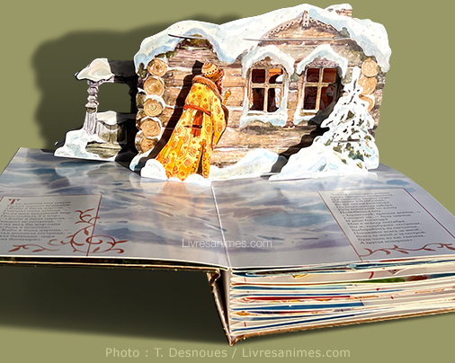 Ekaterina Kazeykina***, conceptrice des pop-ups, a eu l’excellente idée d’utiliser à quatre reprises des rabats latéraux qui s’écartent automatiquement à l’ouverture des doubles-pages, permettant d’ajouter quatre cartouches au lieu de deux.